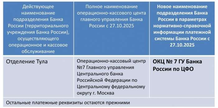 С 27 октября 2025 года изменились платежные реквизиты в части наименования подразделений Банка России, осуществляющих функции расчетного и кассового обслуживания. Остальные платежные реквизиты остаются прежними. Обращаем внимание на указание актуального наименования подразделения Банка России в распоряжениях о переводе денежных средств и документах.