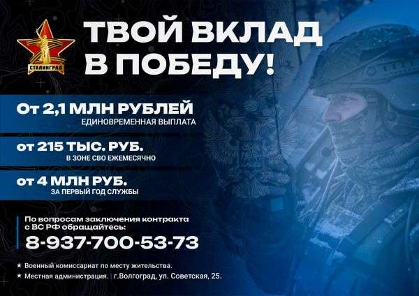 Присоединиться к СВОим и заключить контракт с Минобороны можно, обратившись в пункт отбора в Волгограде по адресу ул. Советская,25, а также в военный комиссариат по месту жительства или в местную администрацию. Всю необходимую информацию можно узнать по телефонам (8442)73-49-96; 8-937-700-53-73.