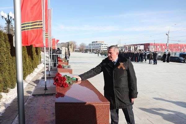 Губернатор Андрей Бочаров у подножия Мамаева кургана возложил цветы к стелам городов-героев, а также тумбам с указанием населенных пунктов Волгоградской области, удостоенных звания «Рубеж Сталинградской доблести».